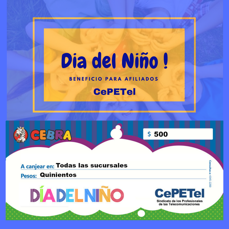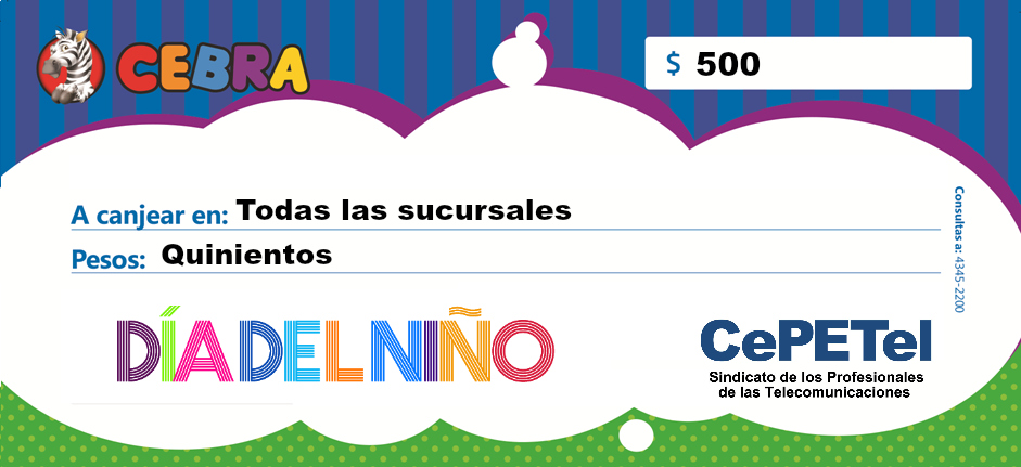 Obsequiamos un voucher de compra para ser canjeado en las Jugueterías Cebra por un valor de $500 para todos los hijos/as de afiliados/as a CePETel que tengan entre 0 y 12 años de edad, inclusive.